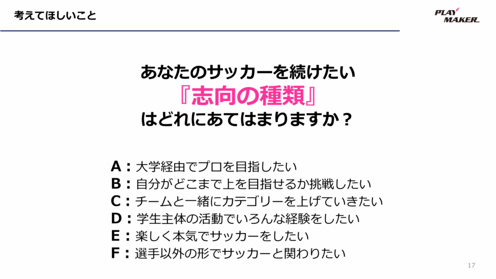 サッカーのレベルはもちろん、自分が将来なにをしたいのか。